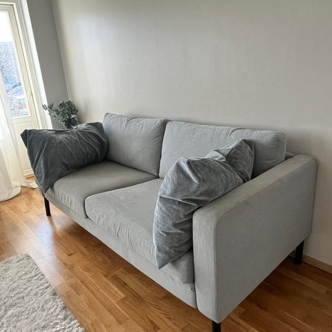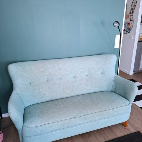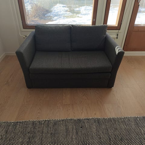 Myydään kuvan sohva. Noin 5 vuotta ollut käytössä, mutta edelleen jousitus ja tyynyt m hyvässä kunnossa, ei painunut tms. Hyvä istua, mutta jousituksen ansioista menee vaikka vierasvuoteenakin. Tyynyt tarroilla kiinni rungossa, joten eivät liu'u pois paikaltaan.