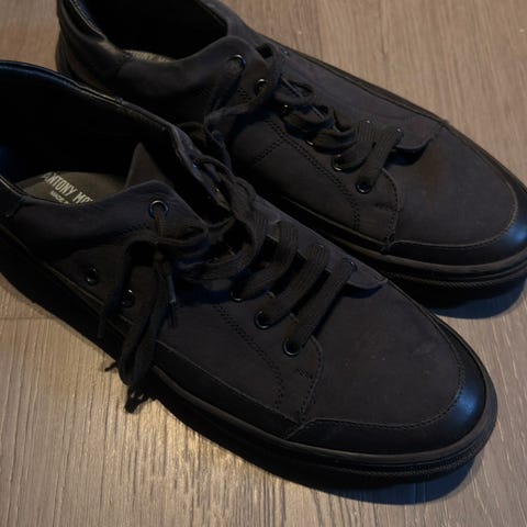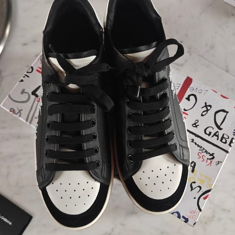 Dolce & Gabbana tennarit, koko 44. Tummansiniset nauhakengät, joissa valkoinen kumipohja ja kuminen kärki. Päällinen näyttää olevan kangasta, kontrastiväriset tikkaukset. Varrellinen malli, sopii arkeen ja vapaa-aikaan. Merkkilogo näkyy kannassa pohjan yläosassa.