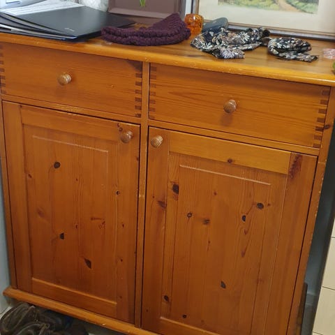 Päällylevy vähän painunut, joten keskeltä edestä vaan n. 69,2 cm, ku reunoilta 69,7 cm. Lakkaus rapissut ja kolhiintunut paikoittain. Nopeimmalle noutajalle Puolarmaarista.