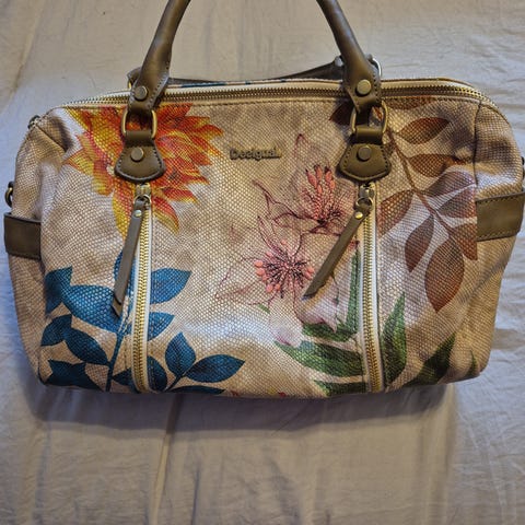 Desigualin kaunis, isokokoinen laukku monivärisellä kuviollisella pinnalla. Laukussa on näyttävä printtikuvio, jossa on muun muassa huulia, kukkia ja graafisia elementtejä. Pitkät kantohihnat mahdollistavat kantamisen olalla tai kädessä. Laukku suljetaan vetoketjulla, ja yläreunassa on läppä nepparikiinnityksellä. Materiaalina on polyesteri. Sopii arkilaukuksi tai mukaan kaupungille, ostoksille tai rannalle, kun tarvitaan tilavuutta ja erottuvaa ulkonäköä.