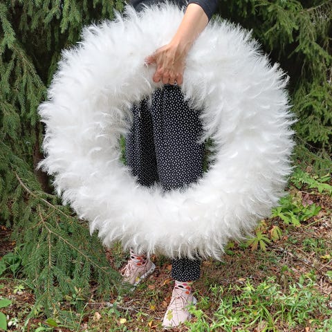 Vanhoja rautalangan ympärille tehtyjä tipuja, pääsiäisnoitia, värjättyjä höyheniä ym.