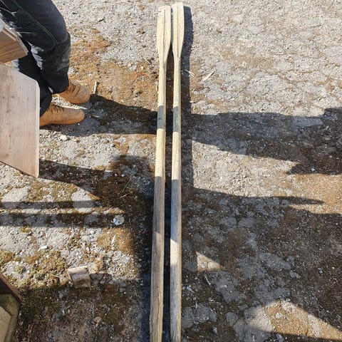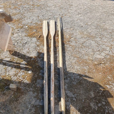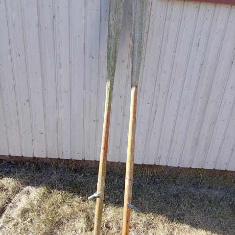 Soutuveneessä olleet ja hyvin toimineet airot vitosen pari. Kunto kohtalainen, joskin parhaat päivänsä nähneet. Airot eivät ole identtiset.