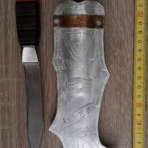 Hyvässä kunnossa oleva tuplapuukko. Ei ole vuoltu lainkaan, vain koristekäytössä.