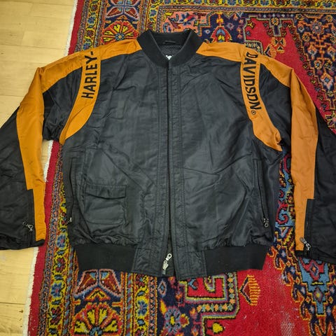 Muuten hienossa kunnossa, mutta hihojen resorit ovat löystyneet eli hanskat vaan niiden päälle jos ajaa. H-D Original 100 1903-2003, made in USA. Koko US XXL, mahtuu mahasta nippanappa 3XL-kokoiselle mallille.