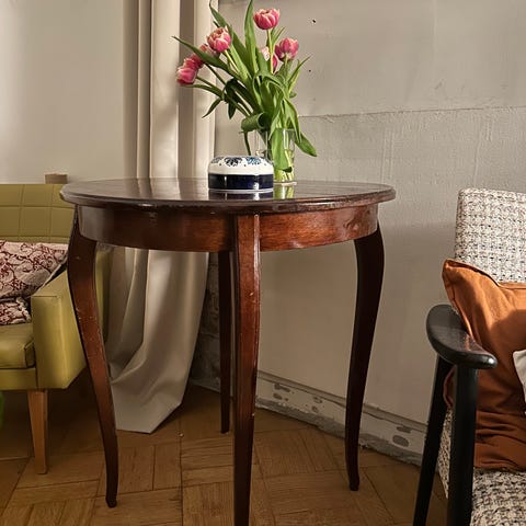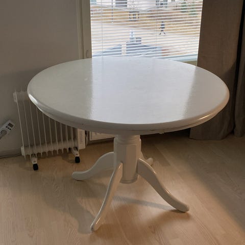 Suomalaisen puusepän mittatilaustyönä valmistama pyöreä ruokapöytä.
