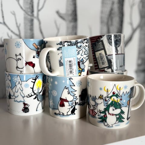 New Moomin mugs from the winter season 2010-2014 that have been discontinued. Skiing competition, snow games, winter forest, under the fir tree and skiing with Mr. Virkkunen. 2013 mug is of 2nd quality, I don't know the reason, I don't see a flaw in it.