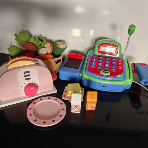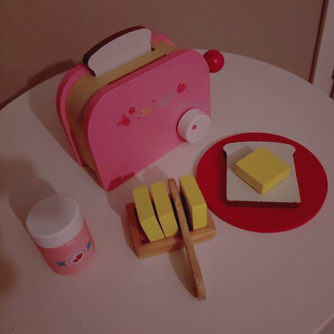 Puinen leivänpaahdin. Uutena ostettu, ollut yhden lapsen leikeissä. Ehjä, muutamia jälkiä löytyy (lisäkuvat).