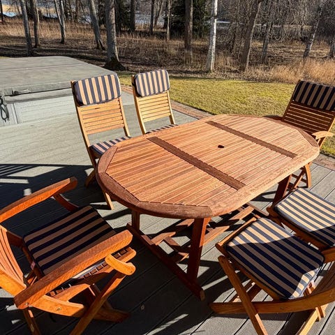 Rottinkijäljitelmämuovia, irrallinen musta pöytälevy, 4 tuolia.