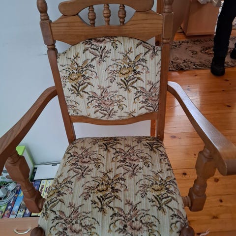 Ruokailuryhmä, johon kuuluu ovaalinmuotoinen puinen ruokapöytä ja viisi tuolia. Pöydässä on lakattu puupinta ja pyöristetyt reunat. Tuoleissa on puurunko ja pehmustetut istuimet, joissa on vihreä–beige ruudullinen kangasverhoilu. Sopii keittiöön tai ruokailutilaan viidelle hengelle. Pöytää saa jatkettua palalla.