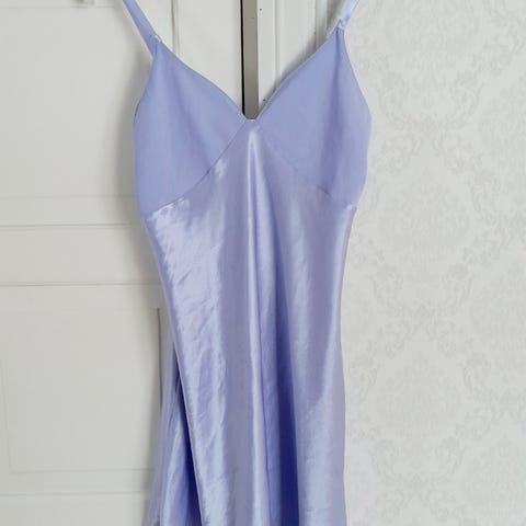 Myydään kaunis, kiiltäväpintainen sininen yöpaita. Tässä mallissa on tyylikkäät mustat pitsireunukset v-pääntiellä ja säädettävät olkaimet täydellisen istuvuuden takaamiseksi. Edessä suloinen musta rusetti.