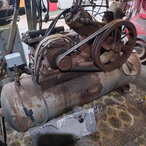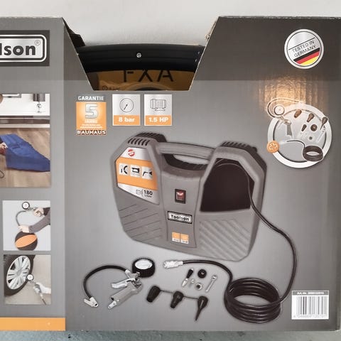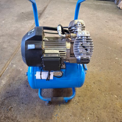 Toimiva kokonaisuus, mutta kompressorin virtakytkin temppuilee ja täyttömittarin venttiilisovittimen vipu on vinossa.