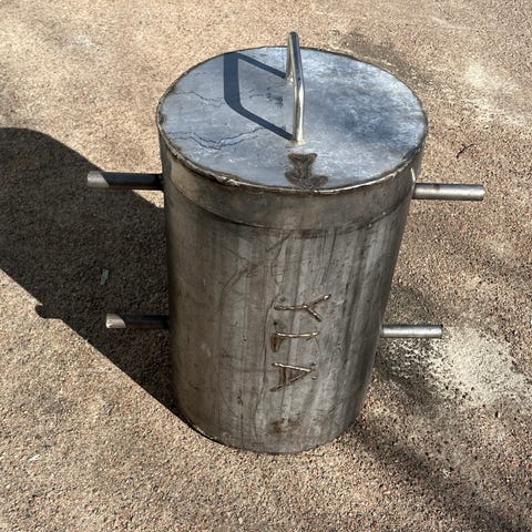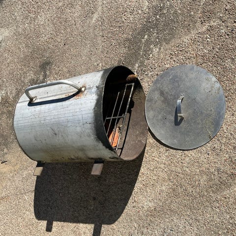 Terästä ilmeisimmin, melkosen painava. Mukana ritilä ja kiinteä taso.