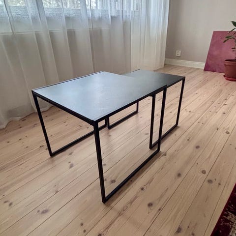 Myydään sohvapöytä. Metalliset jalat. Puujäljitelmä kansi 110x60 cm. Korkeus 45 cm. Puuosissa pieniä käytön jälkiä.