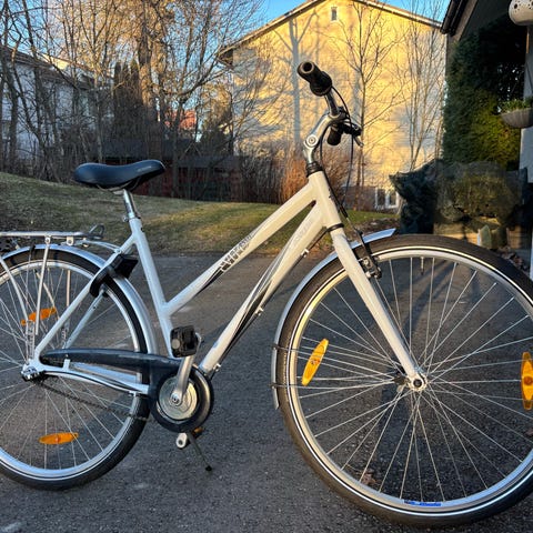 Naisten polkupyörä. 28 tuuman rengas koko, 3 vaihdetta, jalkajarru taakse ja käsijarru eteen.