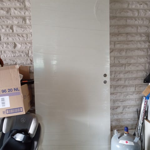 Valkoinen 08 sisäovi, jossa on kevyet urakuviot pinnassa. Ovi soveltuu asunnon tai muun sisätilan välioveksi. Kuvassa näkyy myös painike ja lukkorunko, jotka eivät kuulu kauppaan. 20€ /kpl / tarjoa