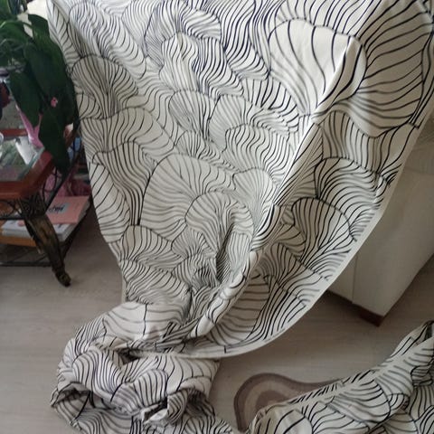 Kuvan kankaat, paksuhko ehkä sisustuskankaaksi tai verhoiksikin sopiva. palojen koko 145 x 260 cm ja 126 x 184 cm, vähän vinoon leikattu, mitat otettu kapeimmasta kohdasta. Painava kangas. Näitä on 2 palaa