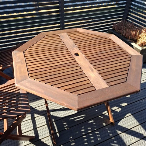 Pirtin pöytä sekä penkit harmaa väriltään.Kaunis ryhmä