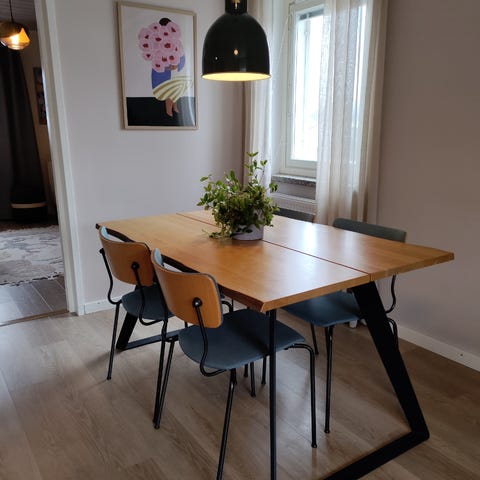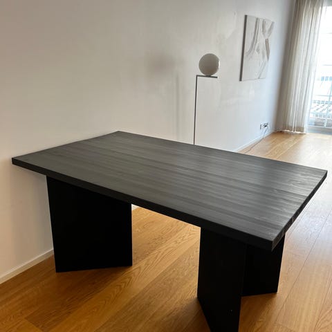 Puusepän vuonna 2021 tekemä massiivitamminen erittäin tukeva ruokapöytä myynnissä perheen kasvun vuoksi. Pöydän pinnassa aitoa puunkuviointia, ns rouhea malli. Jalat mustaa metallia, saa irti kuljetuksen ajaksi. Sopiva neljälle hengelle. Ei käytön jälkiä.