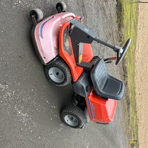 Husqvarna LT112 ajoleikkuri oranssi. Leikkurissa on edessä ilmanottoaukot moottorille. Terät sijaitsee rungon alla. Käyttö soveltuu nurmialueiden leikkaamiseen kotipihoilla ja isoimillakin alueilla. Mallikilvessä malli LT112 ja valmistaja Husqvarna Forest and Garden, Sweden.