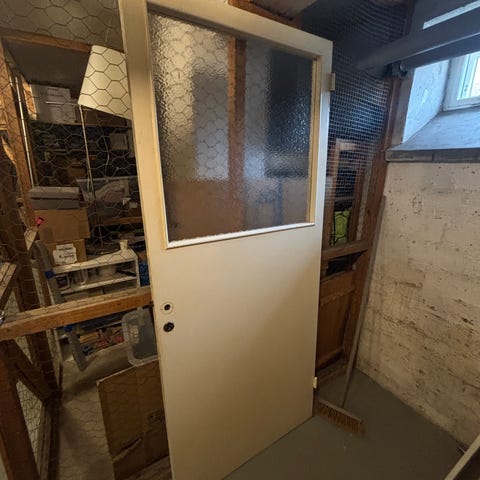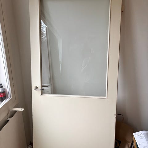Valkoinen sisäovi, jossa metallinen painike ja avainpesä.