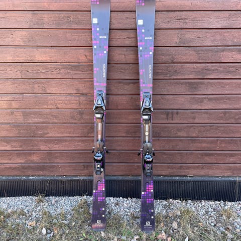 Salomon laskettelusukset: (pituus 140cm) integroiduilla siteillä. Suksissa monivärinen kuosi. Pituus mitattavissa kuvasta mittanauhan avulla. Soveltuvat rinnelaskuun.