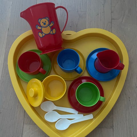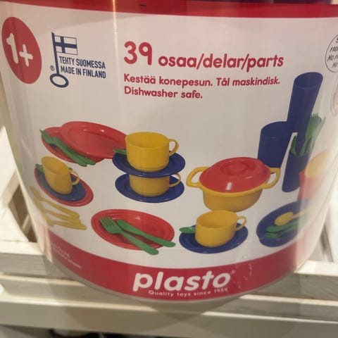 48-osainen leikkiastiasetti koti-, ravintola- tai ulkoleikkeihin tai leikkimökkiin. Mukana aterioita, lautasia, kattila, kannuja, retro vatkain joka toimii nappia painamalla mekaanisesti ym. Muutama posliiniastia, muut muovia.