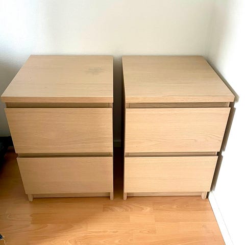 Ikeasta ostettu yöpöytä ovh yli 100€, en muista tarkalleen. Päällä näkyy vähän käytönjälkiä, muuten todella hyvässä kunnossa. Vasemmalle lisätty latureille pidikkeet.