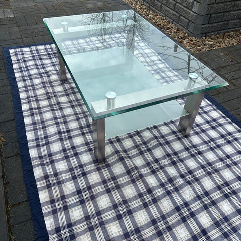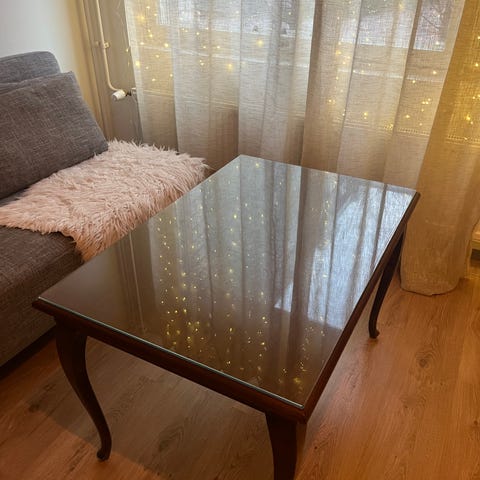 Hyvässä kunnossa oleva sohvapöytä myynnissä muuton alta. Lasilevyssä pari hyvin ohutta naarmua lähellä kulmaa, muuten kunto on kuin uusi. Naarmuja ei huomaa normaalissa käytössä.