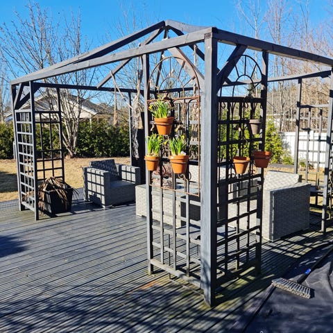 Puutarhapaviljonki terassille koko 3x4 metriä. Tammiston puun malli. Paviljongin materiaali puu. Hintaan sisältyy runko, kangaskatto ja 2 kpl sivuseinä, 4 metriä leveä ja 3 metriä leveä. Paviljongin rungossa joissakin kohdissa pehmentymistä ja vaatii korjaamista. Mutta tämä kokonaisuus myydään pelkästään lähes pelkän kangaskaton hinnalla!! Tällä hetkellä paikallaan terassilla ja purku sovitaan erikseen.