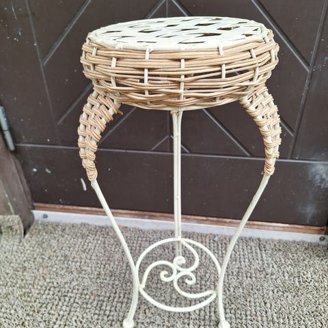 Hauska rottinkikukkateli. Käsityötä on. Pituus n 30 ja ruukun sisähalkaisija on 14 ja korkeus n 11.