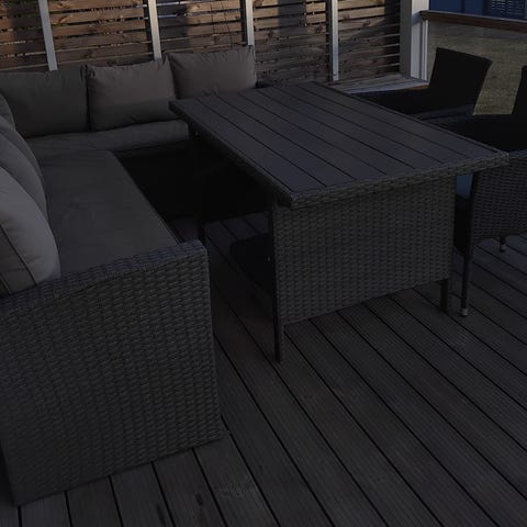 Comfort Garden ruokailuryhmä ulos. Ruokailuryhmä koostuu suuresta suorakulmaisesta pöydästä ja kuudesta tuolista. Runko ja tuolit ovat mustaa polyrottinkia. Ryhmä on suunniteltu ulkokäyttöön terassille tai puutarhaan. Polyrottinkirakenne on helppohoitoinen ja soveltuu ympärivuotiseen ulkokäyttöön.