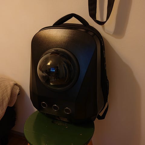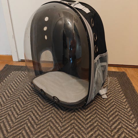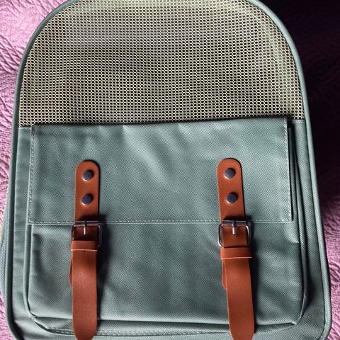 Vähällä käytöllä ollut reppu johon kissa tai pieni koira mahtuu helposti. Todella kevyt, lujaa ja kestävää laatua.