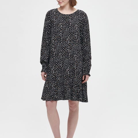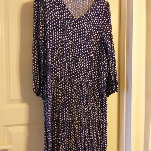 Nanso naisten mekko, koko 40. Mallin nimi on Piste. Tummansininen pohja valkoisilla pilkuilla. Lyhyet hihat ja pyöreä pääntie. Takana vetoketjukiinnitys. Sivusaumoissa taskut.