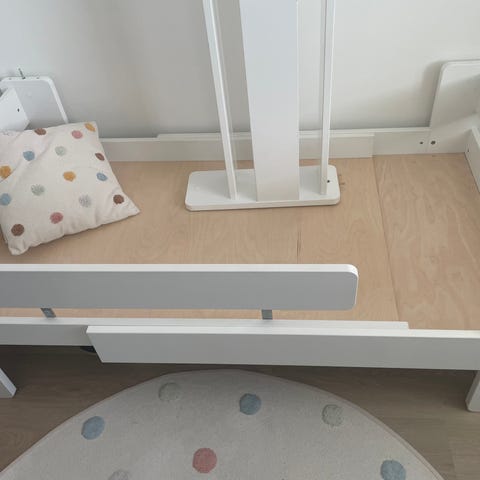 Hyväkuntoinen Unipuu jatkettava lastensänky, pientä käyttökulumaa. Valkoinen runko, jossa rei'itetty levypohja. Sängyssä on lisäturvalaita toisella sivuilla. Kokonaisuuteen kuuluu:
