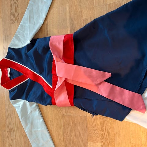 Lasten noitapuku naamiaisasuksi, koko noin 152/158. Pituus n.95cm, kai-kai venytettynä n.40cm. Lasten M koko. Asuun kuuluu pitkä musta-oranssi mekko pitsihihoilla ja nyörikoristeella edessä sekä kaupan päälle noidan hattu, jossa sauma hiukan ratki.