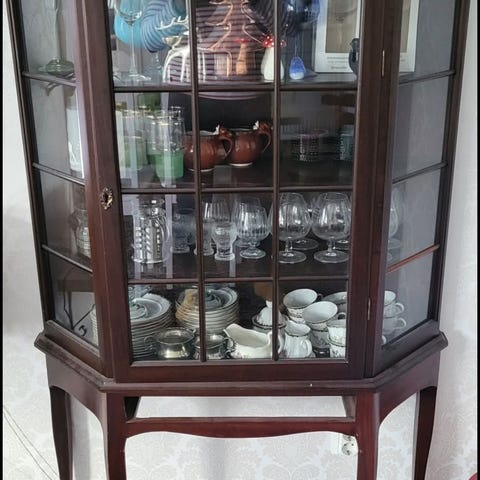 Valkoinen vitriinikaappi, jossa yläosassa lasiovet ja useita säädettäviä hyllyjä. Alaosassa kaapistossa umpiovet ja sisähylly säilytystä varten. Kaapin sivuilla on avohyllyt. Pöytätason reunat ja hyllyjen reunat ovat puunsävyiset. Sopii esimerkiksi olohuoneeseen, ruokailutilaan tai keittiöön astioiden, koriste-esineiden ja muiden tavaroiden säilytykseen ja esillepanoon.