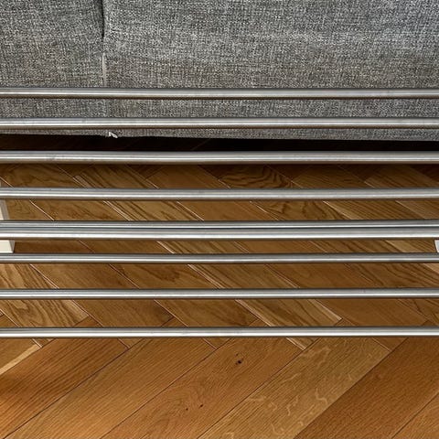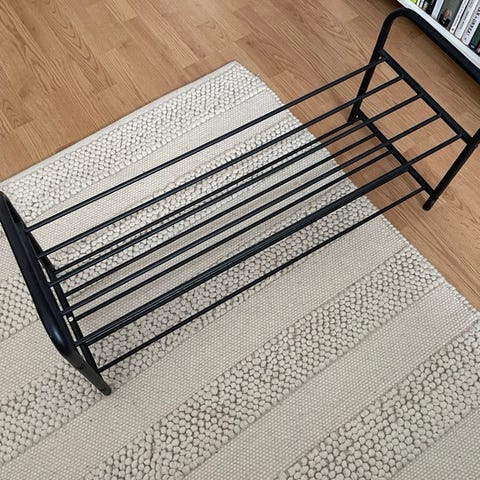 Jysk kenkäteline metallinen musta. Telineessä on useita vaakasuuntaisia. Sopii eteiseen tai muuhun tilaan kenkien järjestämiseen lattialta pois!