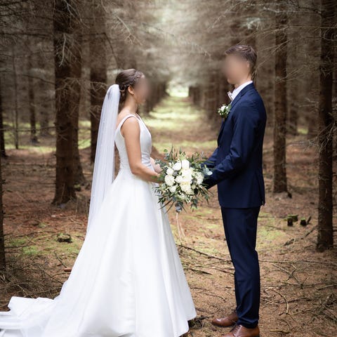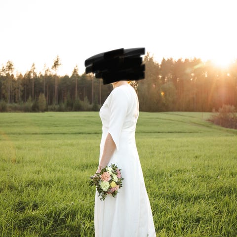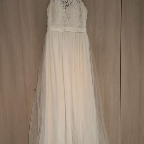 Naisten valkoinen(ivory) satiininen häämekko, koko 36/8/s-m ja ollut 172,5 cm pitkällä morsiammella. Mekossa ei olkaimia ja pitsikoristeltu yläosa. Hameosa on pitkä ja levenevä, takana on laahus. Sopii häämekoksi tai muuhun juhlakäyttöön pitkähkölle naiselle. Mukaan pukupussi.