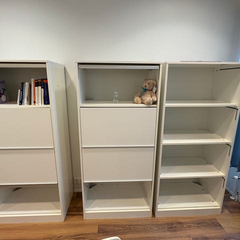Ylimääräiseksi jääneet metalliset Ikean hyllyt kaupan.