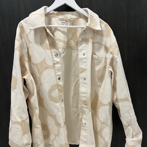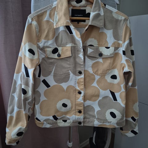 Marimekon ihana Unikko -farkkutakki, jossa vaaleanliilat kukat.