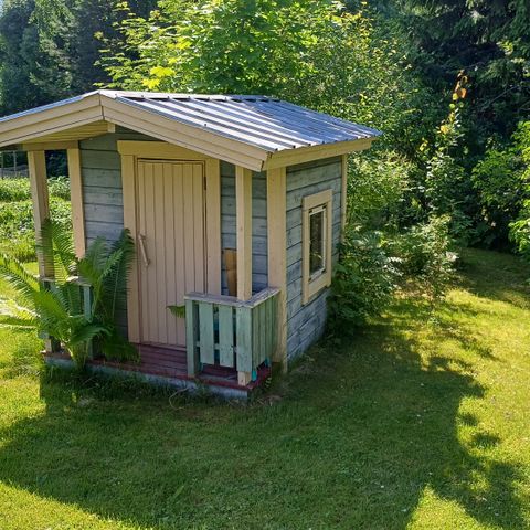 Myyntiin tilava leikkimökki pienellä kuistilla.