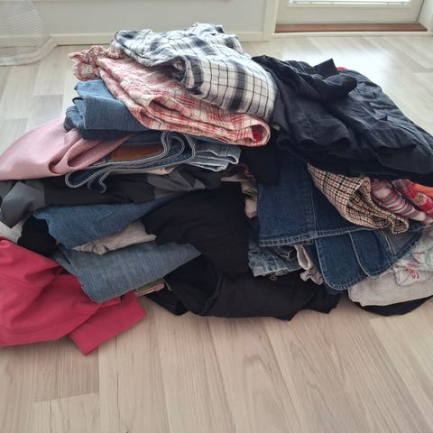 Yli 200 litraa, kymmeniä tuotteita talvitakista kesäåaitoihin. Myös farkut, pikkutakit, mekot, hameet, ulkoiluvaatteet, hatut, huivit, jne.