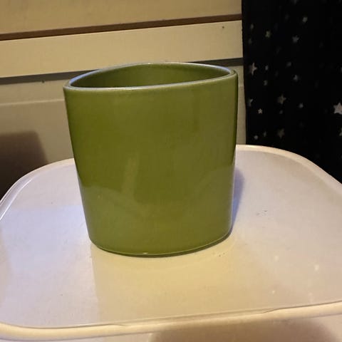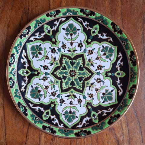 Arabia lautanen, halkaisija noin 26 cm. Lautanen on vaaleaa keramiikkaa, jossa on vihreä, ornamenttimainen koristekuvio reunassa ja keskellä. Pohjassa on Arabian leima ja mallimerkinnät. Soveltuu esimerkiksi ruoka- tai tarjoilulautaseksi. Kuvissa näkyy lasitteen hienojakoista krakeloitumaa, joka on tyypillistä vanhemmalle keramiikalle.