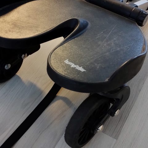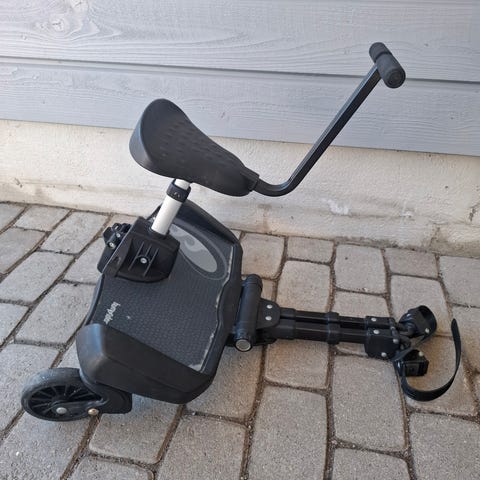 Kahdella lapsella ollut käytössä, hieman kulunut seisomalauta irrotettavalla istuimella. Istuin todella hyvässä kunnossa, mutta seisomalaudan yksi kiinnike/säädin löystyy hieman, pysyy kyllä hyvin paikoillaan.