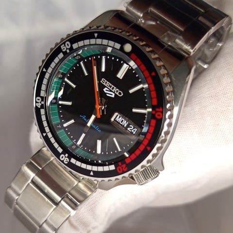 Uutta tavaraa etikettineen, pakkauksineen ja takuutodistuksineenSeiko 5 SportsSeiko 5 Sports US Special Creation. Tämä tyylikäs kello antaa klassiselle urheilulliselle ja elegantille designille uutta hienostusta ja tarjoaa monipuolisen arjen käyttömukavuuden huippuluokkaa. Tämä dynaaminen kello hyödyntää automaattista teknologiaa, jota voit ohjata jokaisella liikkeellä. Se käynnistyy 24 jalokivellä varustetulla kellomekanismilla, jonka taajuus on 21 600 puoliaaltoa tunnissa, käyntivarmuus on noin 41 tuntia ja siinä on käsivetoinen viritys. Mustan, yksipuolisesti pyörivän kiertokiven ympäröimä näyttö osoittaa ajan, ja grafiitinharmaa, auringonlaskunimeltään riffattu kellonjakso olisi valovoimainen sekä päivämäärä-/päiväkalenteri. Tämä poikkeuksellinen kaksivärisestä teräksestä valmistettu kello on kolminkerroin taittuvalla puristuslukolla varustettu sekä ruuveilla kiinnitettävä läpinäulottuva kotelo, joka paljastaa klassisen ajanmittauksen toiminnassa. 10 bar, 100 m vedenkestävyys.Seiko 5 Sports US Sonderkreation. Alun perin lanseerattu Yhdysvaltain markkinoille, nyt saatavilla valituilla markkinoilla maailmanlaajuisesti Automaattinen käsiveto-ominaisuus Musta, yhdensuuntaisesti pyörivä bezel ajan kulumisen ajaksi Antrasiitinharmaa kellotaulu auringonlitteillä Päivämäärä-/päiväkalenteri Hehkuvat osoittimet ja merkit Päivitetty, läpinäkyvä koteloa ruuvilla varustettu Takaa Kolminkertaisella taittuvalla puristuslukolla.OminaisuudetTekniset tiedotKELLON KOKO: Ø 42,5 mm LEVEYS: 13,4 mm PITUUS: 46 mmLIIKKUJA: Automaattinen Kaliber 4R36 21 600 puoliväliä tunnissa 24 jalokiveä Käyntivarmuus: noin 41 tuntiaKAULAKKOR:i? (Täydennys) Ruostumattomasta teräksestä valmistettu kotelo – kaksivärinen KIDE-PÄÄKIVI: Hardlex-kristalli VEDENKESTÄVYYS: 10 bar, 100 metriä (330 jalkaa) RANNEKE: Kaksivärinen ruostumattoman teräksen ranneke RANNEKEKOKO: 22 mm