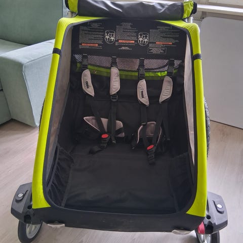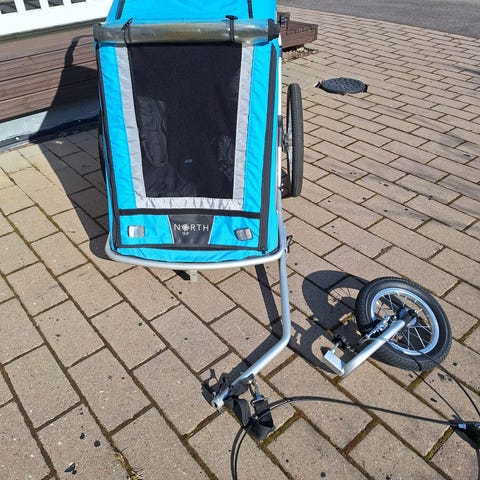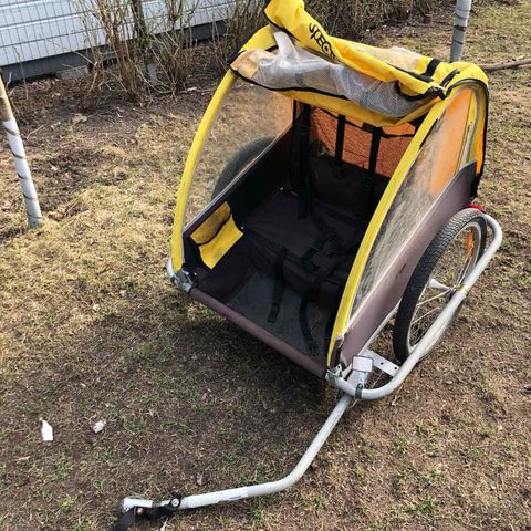 Hamax lasten pyöräkärry ja juoksurattaat. Kolmipyöräinen malli, jossa suuret ilmakumirenkaat takana ja kääntyvä etupyörä. Vetokytkin polkupyörään sekä iso etupyörä ja työntöaisa kävelyä ja juoksua varten. Suojaava kuomu, jossa hyttysverkko ja sadesuoja sekä sivuikkunat. Sisällä istuin ja turvavyöt.