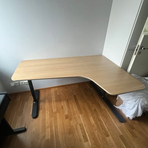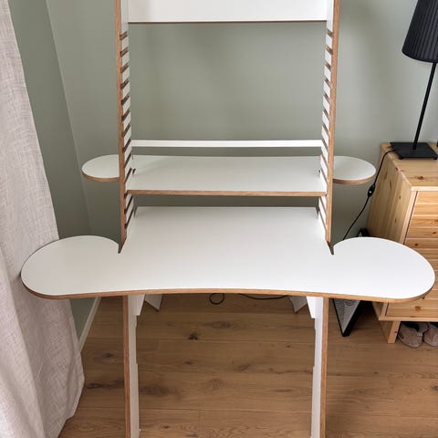 Metallinen, portaattomasti säädettävä työpöytä, missä laippajalka. Laadukas ja tukeva. Erinomaisessa kunnossa. Pöydän leveys 70cm, syvyys 45cm. Tason korkeus max 107cm.