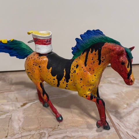 Nuoren ammattitaitoisen taidenäyttelyitä pitävän ja kansainvälisestikin taidettaan myyvän tyttäreni taidolla ja mielikuvituksellisella tarkkuudella kustomoituja USA:sta tilattuja Breyer-hevosmalleja. Näitä on olemassa vain yksi kappale jokaista koko maailmassa. Breyer on USA:ssa suosittu keräilymerkki jota moni aikuinenkin keräilee isossa mittakaavassa. Erikoishevosten hinnat pyörivät useissa satasissa, ja vuosittain järjestetään festivaali näille hevosille. Oma erityinen taidelajinsa on valmiiden hevosten muuttaminen taiteeksi. Tästäkin kisataan vuosittaisissa kilpailuissa.
