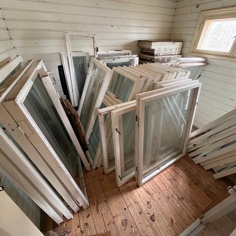 Vanhoja eri kokoisia ikkunoita esim. kasvihuoneprojektiin. Yksinkertaiset ehjät lasit kaikissa nopean vilkaisun perusteella. Sekä ulkopuolen laseja, että sisälaseja, joissa ei alareunan huullosta. Maalit ja kitit aika rapistuneet, myös pari pokaa osin lahonneet. Suurimmilta osin ihan jämäköitä.