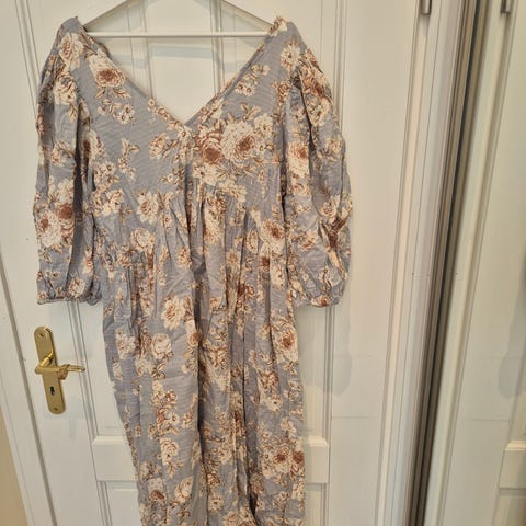 Mekossa on monivärinen, kukkakuvioinen kangas vaalealla pohjalla. Malli on lyhyehkö ja väljä, ja siinä on puhvihihat. Sopii käytettäväksi kesämekoksi arkeen tai juhlaan.